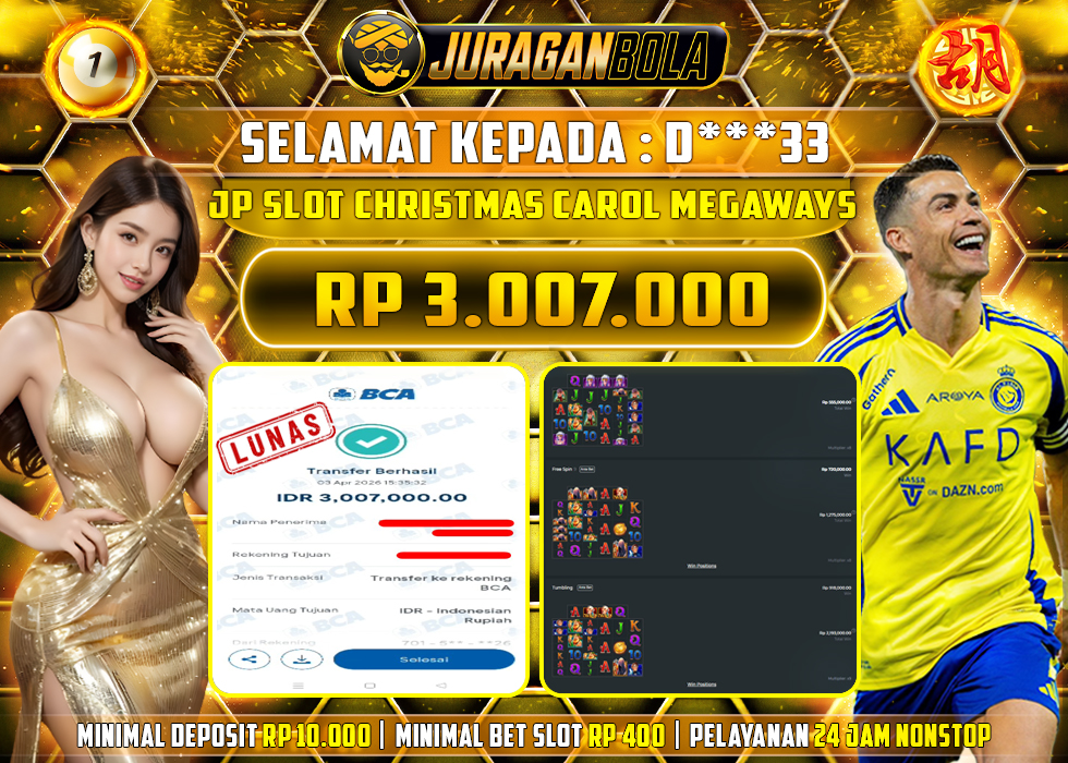Selamat kepada user id: D***33 telah berhasil mendapatkan kemenangan pada permainan CHRISTMAS CAROL MEGAWAYS dengan kemenangan sebesar Rp.3.007.000, Setelah mengisi formulir withdraw dengan kurang waktu 3-10 menit pihak JURAGANBOLA sudah melakukan transfer kepada pemilik userid dan dana sudah dapat dicairkan oleh pemenang. Bukti pembayaran yang kami berikan merupakan bukti pembayaran yang SAH / VALID yang langsung didapatkan melalui tanda transfer transaksi dari bank resmi indonesia.
