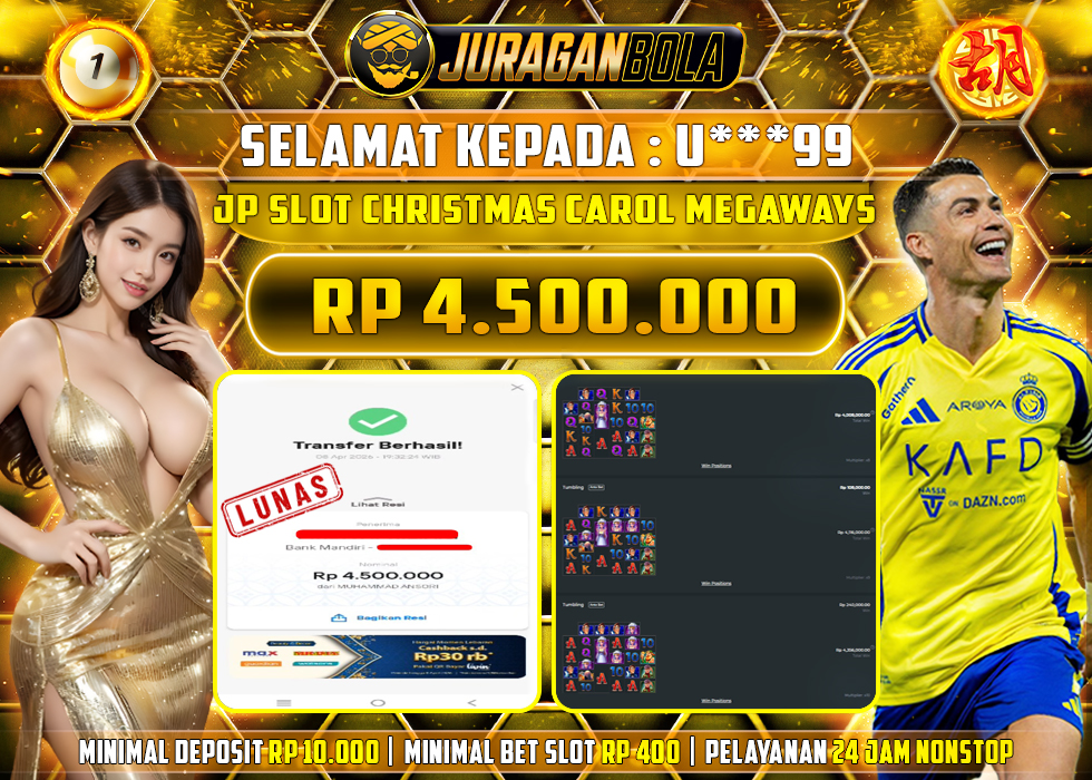Selamat kepada user id: U***99 telah berhasil mendapatkan kemenangan pada permainan CHRISTMAS CAROL MEGAWAYS dengan kemenangan sebesar Rp.4.500.000, Setelah mengisi formulir withdraw dengan kurang waktu 3-10 menit pihak JURAGANBOLA sudah melakukan transfer kepada pemilik userid dan dana sudah dapat dicairkan oleh pemenang. Bukti pembayaran yang kami berikan merupakan bukti pembayaran yang SAH / VALID yang langsung didapatkan melalui tanda transfer transaksi dari bank resmi indonesia.