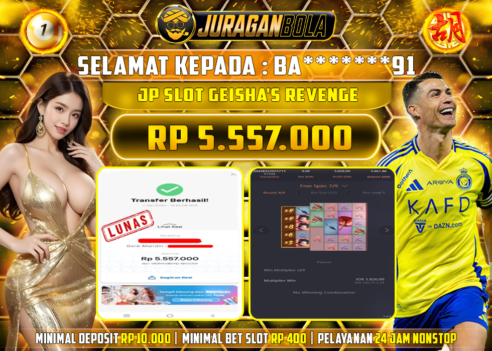 Selamat kepada user id: BA*******91 telah berhasil mendapatkan kemenangan pada permainan GEISHA'S REVENGE dengan kemenangan sebesar Rp.5.557.000, Setelah mengisi formulir withdraw dengan kurang waktu 3-10 menit pihak JURAGANBOLA sudah melakukan transfer kepada pemilik userid dan dana sudah dapat dicairkan oleh pemenang. Bukti pembayaran yang kami berikan merupakan bukti pembayaran yang SAH / VALID yang langsung didapatkan melalui tanda transfer transaksi dari bank resmi indonesia.