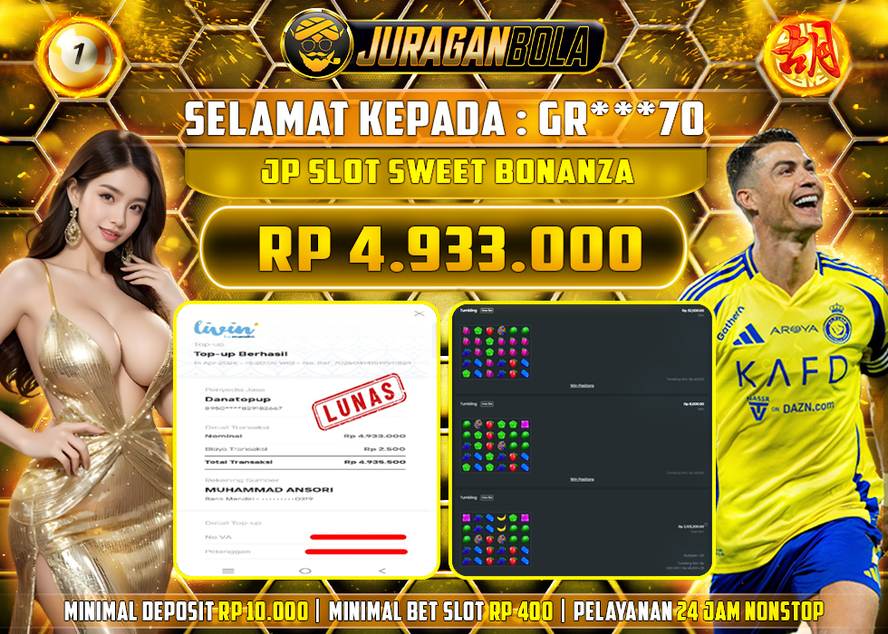 Selamat kepada user id: GR***70 telah berhasil mendapatkan kemenangan pada permainan SWEET BONANZA dengan kemenangan sebesar Rp.4.933.000, Setelah mengisi formulir withdraw dengan kurang waktu 3-10 menit pihak JURAGANBOLA sudah melakukan transfer kepada pemilik userid dan dana sudah dapat dicairkan oleh pemenang. Bukti pembayaran yang kami berikan merupakan bukti pembayaran yang SAH / VALID yang langsung didapatkan melalui tanda transfer transaksi dari bank resmi indonesia.